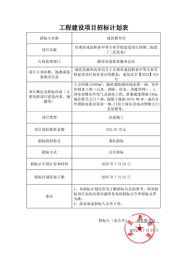 招標計劃表—甘肅省成縣職業(yè)中等專業(yè)學校建設項目四期二標段.pdf