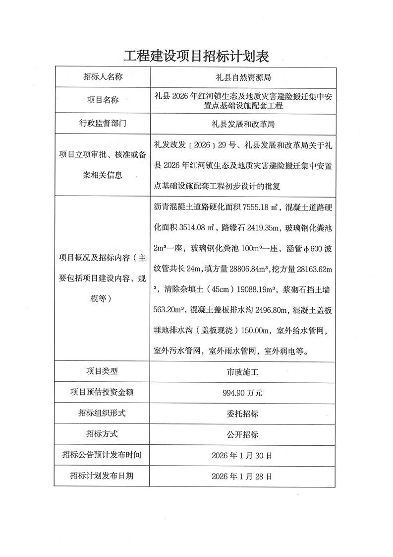 禮縣2026年紅河鎮(zhèn)生態(tài)及地質(zhì)災(zāi)害避險搬遷集中安置點基礎(chǔ)設(shè)施配套工程