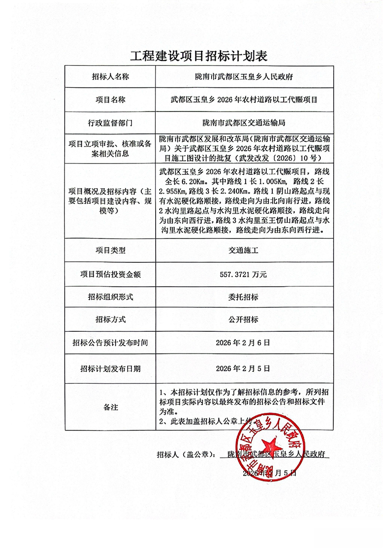 武都區(qū)玉皇鄉(xiāng)2026年農(nóng)村道路以工代賑項目