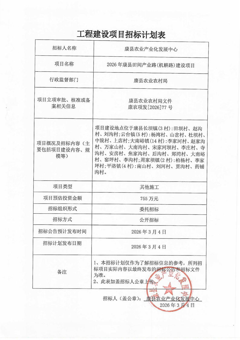 2026年康縣田間產(chǎn)業(yè)路(機(jī)耕路)建設(shè)項(xiàng)目
