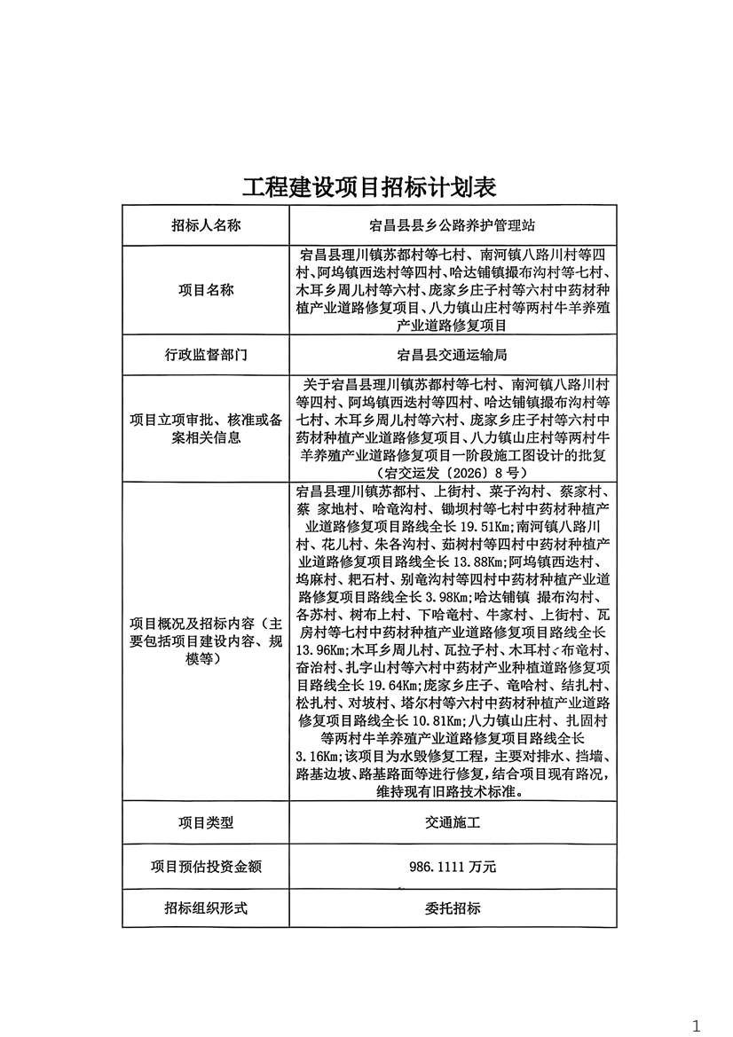 宕昌縣理川鎮(zhèn)蘇都村等七村、南河鎮(zhèn)八路川村等四村、阿塢鎮(zhèn)西迭村等四村、哈達(dá)鋪鎮(zhèn)撮布溝村等七村、木耳鄉(xiāng)周兒村等六村、龐家鄉(xiāng)莊子村等六村中藥材種植產(chǎn)業(yè)道路修復(fù)項(xiàng)目、八力鎮(zhèn)山莊村等兩村牛羊養(yǎng)殖產(chǎn)業(yè)道路修復(fù)項(xiàng)目